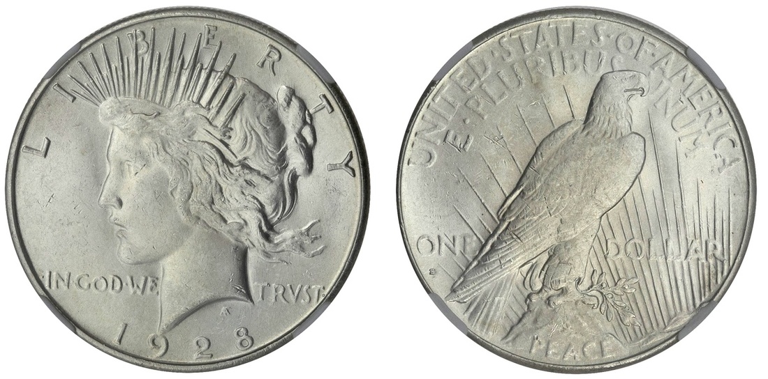 1928-S Peace Dollar. NGC MS62. Satiny white, with a decent strike.