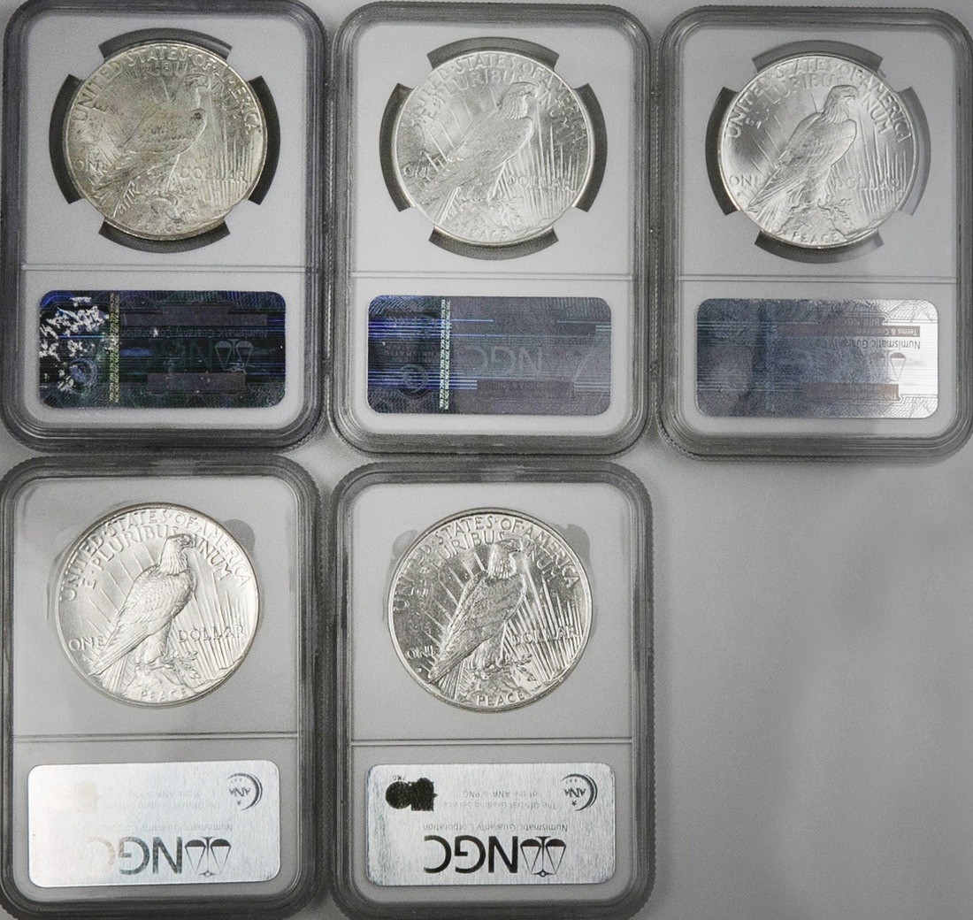 A Nice Grouping of NGC Certified Peace Dollars. 1922 MS 63; 1926 MS63; 1926-S MS64; 1928-S MS 62; 1934-D AU 55.