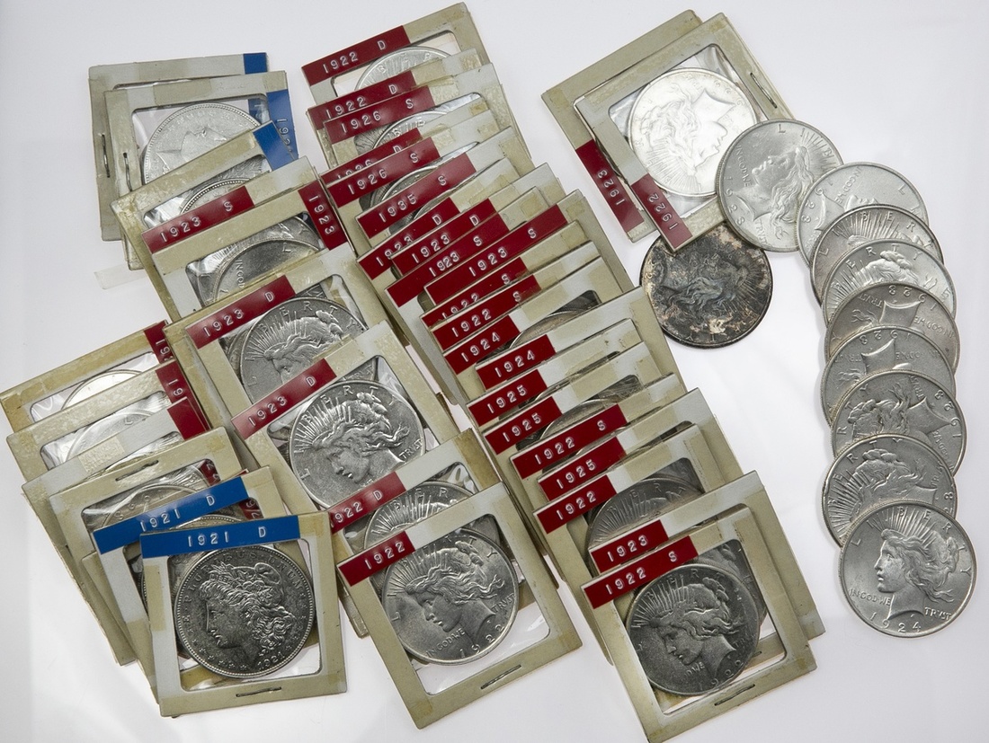Peace Dollar Assortment and More. VF to AU(36), 1 Cull, BU(9). Also included are two 1921 Morgan Dollars and two 1921-D Morgan Dollars. No scarce dates, but still a very useful lot.