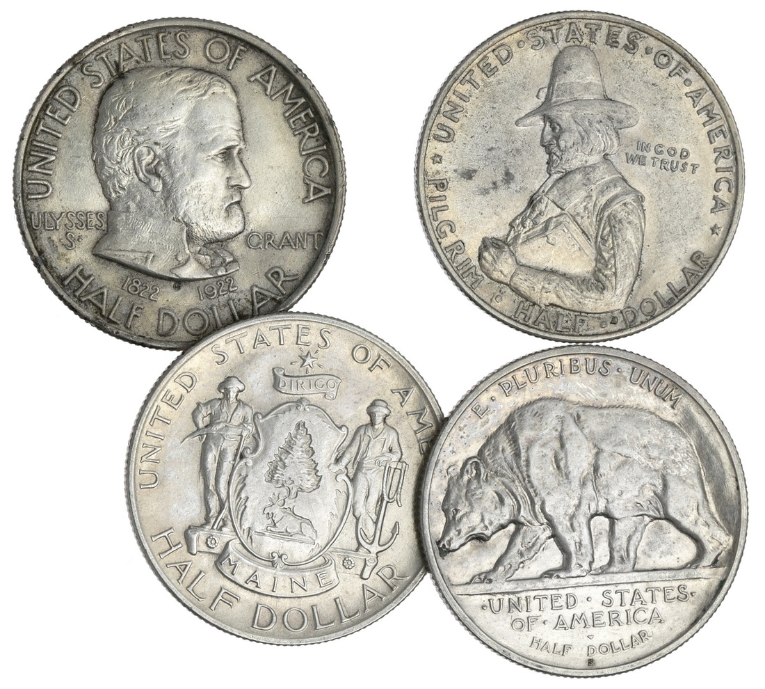 Quartet of Commemorative Silver Half Dollars. 1920 Maine AU; 1920 Pilgrim Unc. details, impaired surface; 1922 Grant EF; 1925 California Jubilee EF.