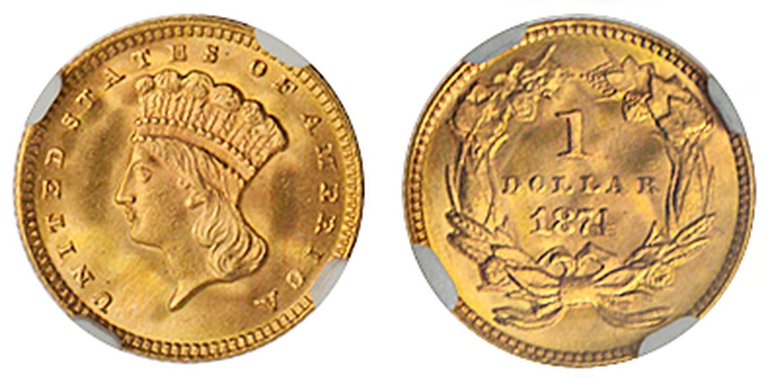 1874 $1 Gold. NGC MS 68. A magnificent example with bold types in pristine fields awash in entrancing lustre.