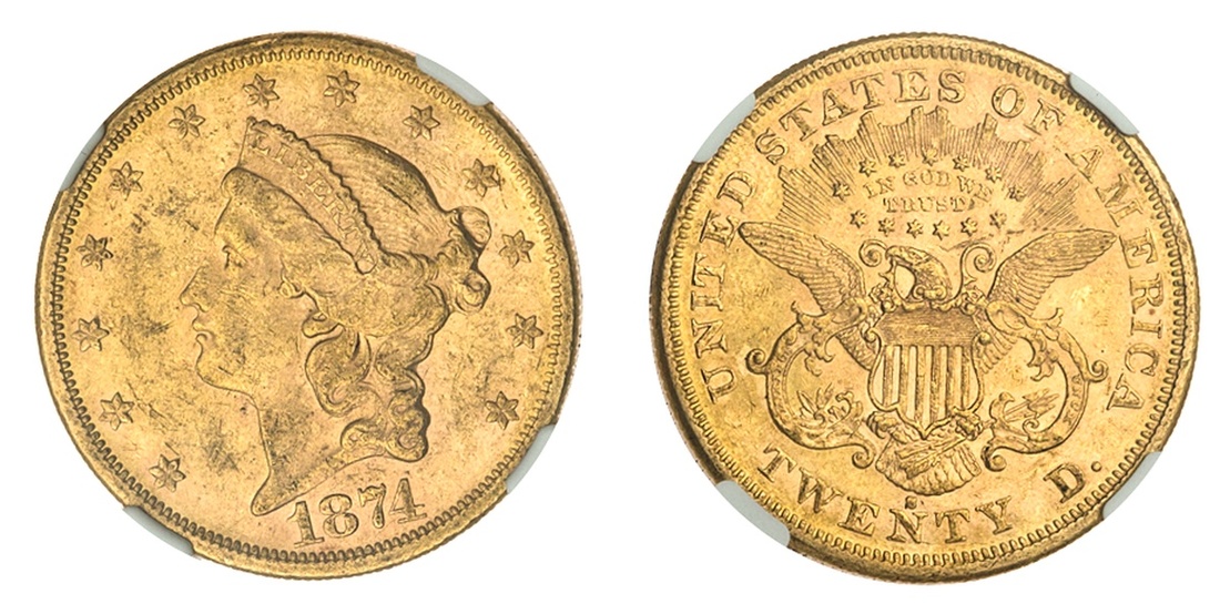 1874-S $20 Liberty. NGC AU 58. This example shows almost all of the details of an Uncirculated specimen.