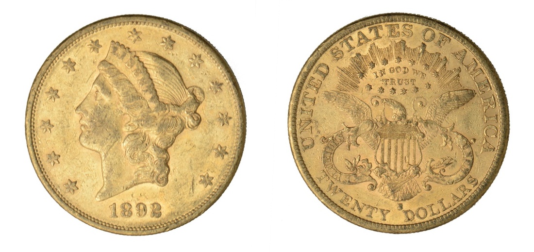 1892-S $20 Liberty. Choice Almost Uncirculated.
