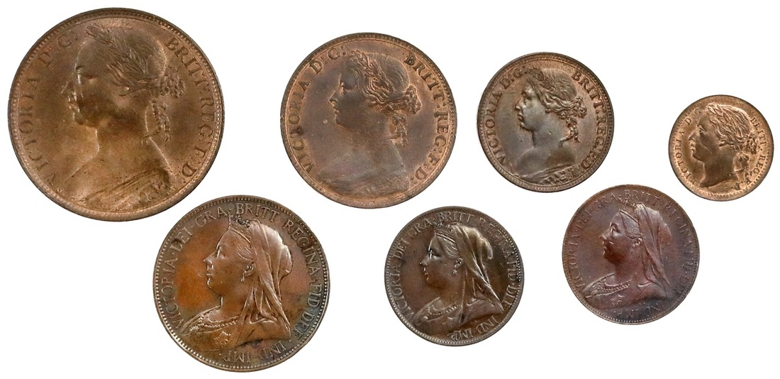 Great Britain. Victoria (1837-1901). Septet of AEs: 1890 Penny, Uncirculated; Halfpennies, 1874 H (six berries) 1895; Farthings, 1879, 1900, 1901. Extremely Fine; and Third Farthing, 1884, obverse die flaw, Uncirculated. (7)