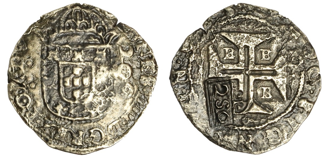 Brazil. Afonso VI (1656-1667). Countermarked Coinage. 250 Reis (1663). 6.15 gms. Crowned "250" in rectangular punch c/m on the reverse of an Evora mint João IV 200 Reis (KM 51), the "E's" all face right. KM 33.1. Salved, now toned. Very Fine.