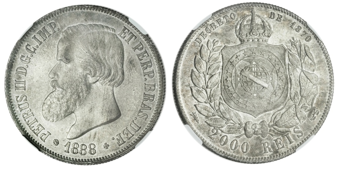 Brazil. Pedro II (1831-1889). 2000 Reis, 1888. Head left, rev. Crowned Arms within wreath. KM 485. Satiny white and soft iridescent hues. NGC MS 64.