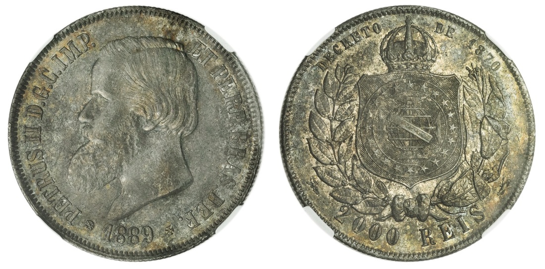 Brazil. Pedro II (1831-1889). 2000 Reis, 1889. Head left, rev. Crowned Arms within wreath. KM 485. Last year of issue. NGC MS 63. Attractive champagne gold and cobalt blue hues.