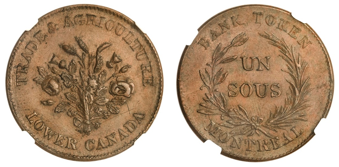 Canada. Lower Canada. Bank of Montreal. Trade & Agriculture. Sous Token, ca. 1835. Bouquet. Ch.LC-2A3. NGC MS 62. Ex Doug Robins Collection.
