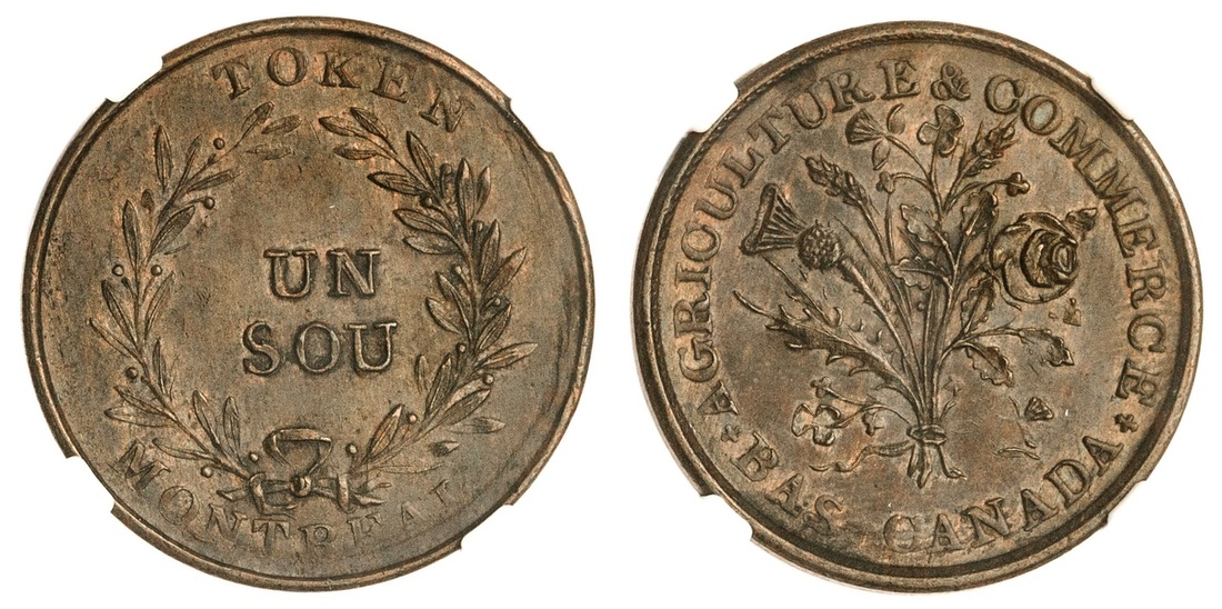 Canada. Lower Canada. Bank of Montreal. Agriculture & Commerce. Sous Token, ca. 1837. French obverse legend. Bouquet, six shamrocks. Ch.LC-39. NGC MS 61 BN. Pleasing example. Ex Doug Robins Collection.