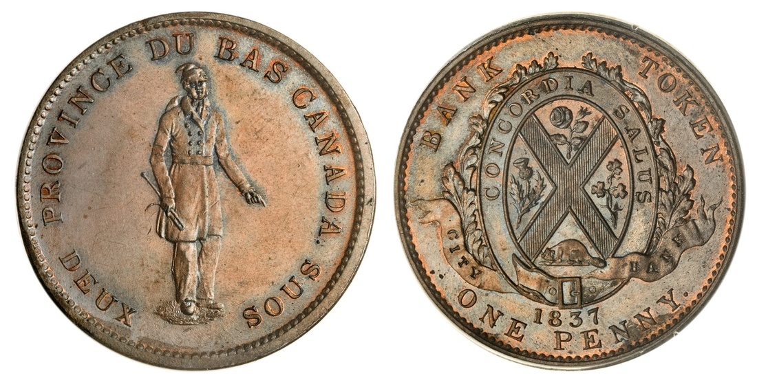 Canada. Lower Canada. 2 Sous - Penny Token, 1837. Habitant standing, rev. St. Andrew Cross Arms within wreath, CITY BANK on ribbon. Breton 521, Ch. LC-9A3. Lovely cobalt-blue and pearlescent hues. CCCS MS 64.