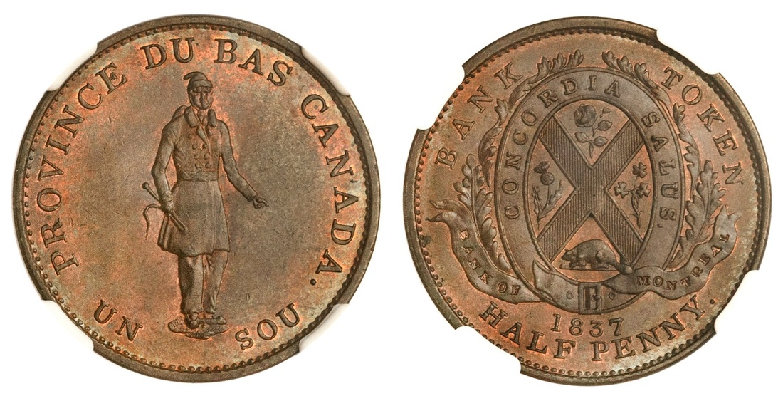 Canada. Lower Canada. Sous - Halfpenny Token, 1837. Habitant standing, rev. St. Andrew Cross Arms within wreath, CITY BANK on ribbon. Ch.LC-8A1. NGC MS 64 BN. Orange-brown, attractive.