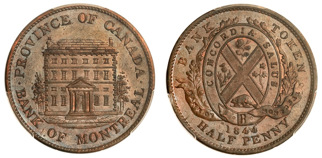 Canada. Province of Canada. Bank of Montreal. Sous - Halfpenny 1844. Small trees, short nose. Front view of bank, St. Andrew Cross Arms within wreath, BANK OF MONTREAL on ribbon. Breton 527, Ch.PC-1B5. PCGS MS 66 BN. Rare so nice.