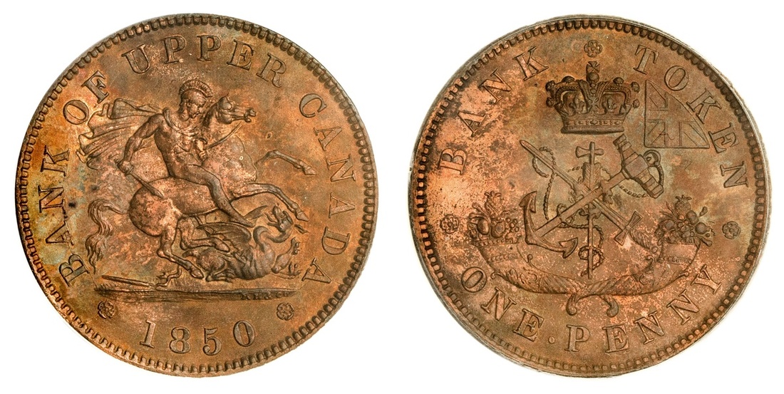 Canada. Province of Canada. Bank of Upper Canada. Penny, 1850. Without dot. St. George, rev. Crossed anchor and sword, crown above, crossed cornucopia below. Breton 719, Ch.PC-6A1. CCCS MS 63. Red and brown.