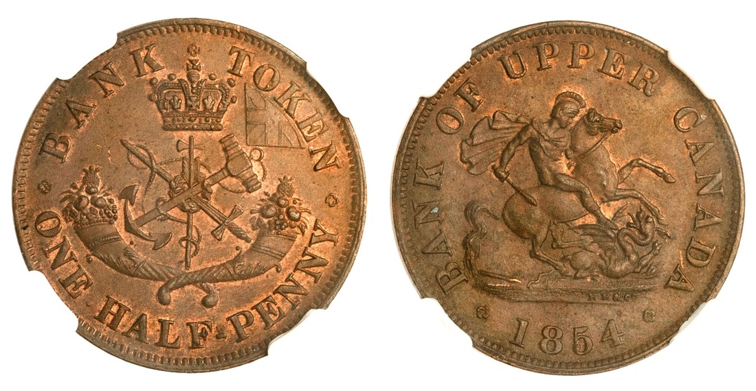 Canada. Province of Canada. Bank of Upper Canada. Halfpenny, 1854. Plain '4'. St. George, rev. Crossed anchor and sword, crown above, crossed cornucopia below. Ch.PC-5C1. NGC MS 64 BN. Orange-brown.