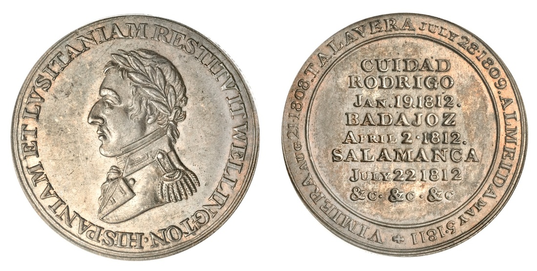 Canada. Wellington - Peninsular. Halfpenny Token, (1812). Copper. Uniformed bust left, laurel wreath with 10 leaves, one small lock above two large locks in hair, rev. Cuidad Rodrigo….Salamanca. Breton 987, Ch.WE-11A2. CCCS PF-64. Deep café au lait with orange highlights. Rare in this grade.