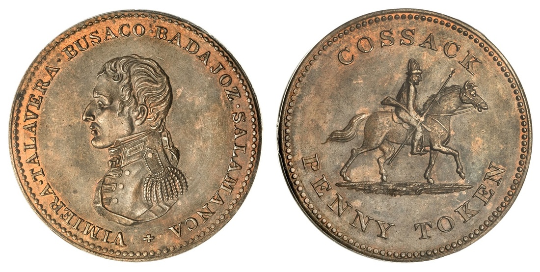 Canada. Wellington - Cossack. Penny Token, (1813). Uniformed bust left, with BUSACO in legend, rev. Cossack riding right. Ch.WE-13. CCCS MS 63. Coffee-brown with orange peripheral highlights.