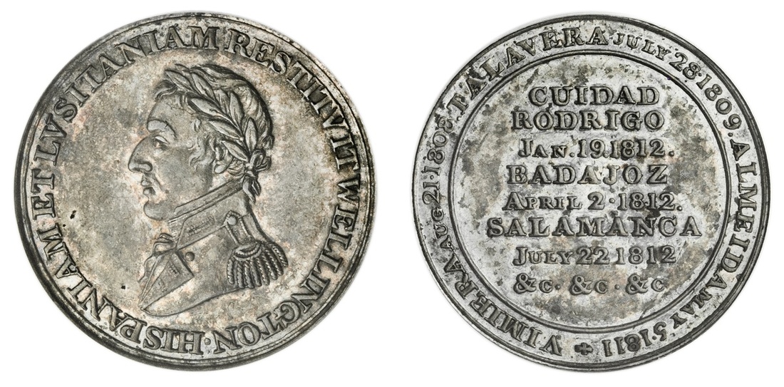 Canada. Wellington - Peninsular. Halfpenny Token, (1812). Silver. Uniformed bust left, laurel wreath with 10 leaves, one small lock above two large locks in hair, rev. Cuidad Rodrigo….Salamanca. Breton 987, Ch.WE-11A2, WEL-5b. Rare in Silver. CCCS AU 55.