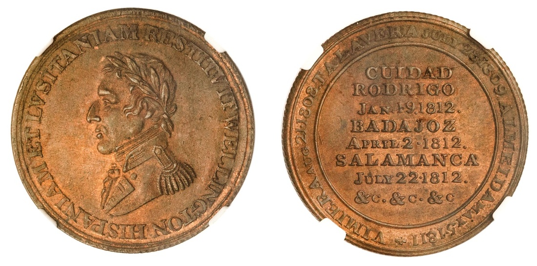 Canada. Wellington - Peninsular. Halfpenny Token, (1812). Uniformed bust left, laurel wreath with 10 leaves tied with a single bow, rev. Cuidad Rodrigo….Salamanca. Ch.WE-11A5. NGC MS 65 RB.