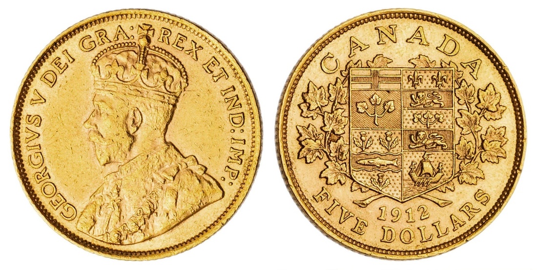 Canada. George V (1910-1936). 5 Dollars, 1912. Crowned bust left, rev. Arms within wreath. KM 26. Extremely Fine.