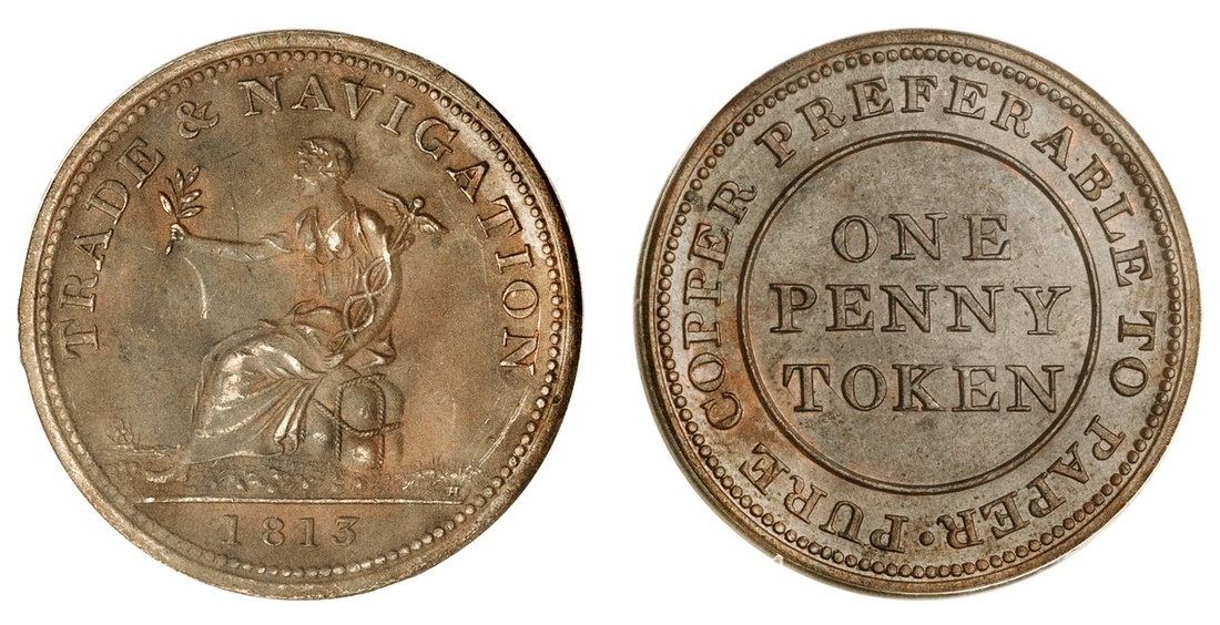 Nova Scotia. Pure Copper Preferable to Paper - Trade & Navigation. Penny Token, 1813. Commerce seated left. Large leaves, bar ampersand; period in reverse legend high. Breton 962, Ch.NS-20A1. CCCS MS 62. Coffee-brown.