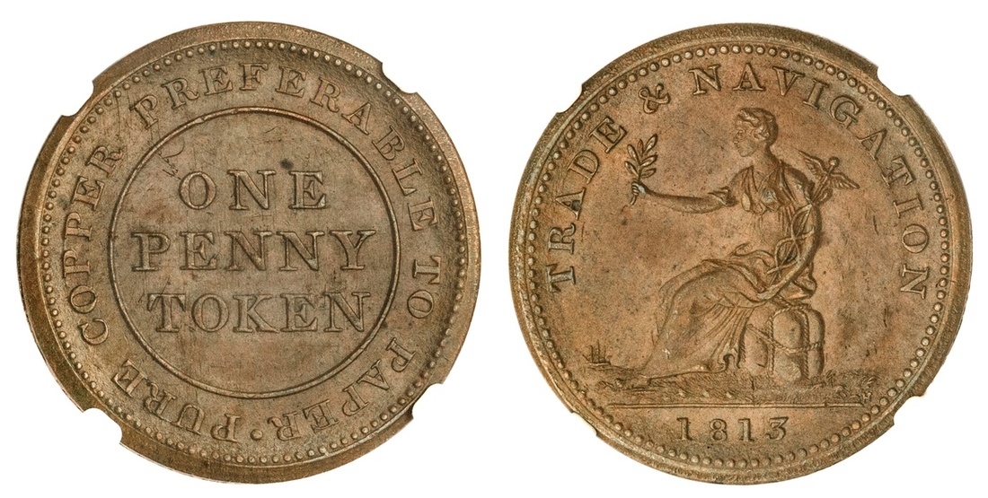 Nova Scotia. Pure Copper Preferable to Paper - Trade & Navigation. Penny Token, 1813. Commerce seated left. Leaves on ground. Ch.NS-20A3. NGC MS 63 BN.