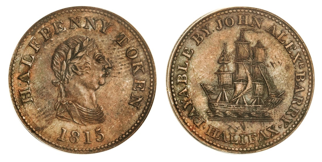 Nova Scotia. John Alexander Barry, Halifax. Halfpenny Token, 1815. Small George III bust right, wreath with 7 leaves, rev. Ship at sail. Coin rotation. Breton, 891, Ch.NS-14A5. CCCS MS 63. Brown.
