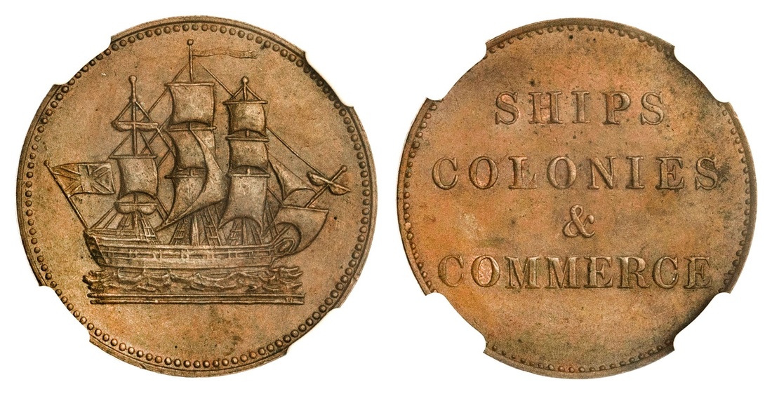 Prince Edward Island. Ships, Colonies & Commerce. Token, ca. 1835. Single H, British flag straight, border beads not uniform. Ch.PE 10-23. NGC MS 62 BN. Ex Doug Robins Collection.