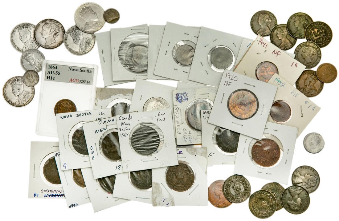 Canada - Maritimes Lot. Includes: Newfoundland. 50 Cents, 1898, 1909, 1917C (2), 1918C; 25 Cents, 1917 C, 1919 C, and George VI 5 Cents (2, one damaged). VG-Fine; Complete date set of Large and Small Cents, 1865-1947. Large Cents, About VG-VF, a few with minor problems. 1885 with scratches, the 1888 Fine. The Small Cents, Fine-EF; Nova Scotia. Half Cent, 1861 EF, 1864. ACG AU 55, Cents 1861 (2), 1865. Fine; New Brunswick. Cents, 1861, 1864; and Prince Edward Island. Cents, 1871 (3). About F-About VF (47)