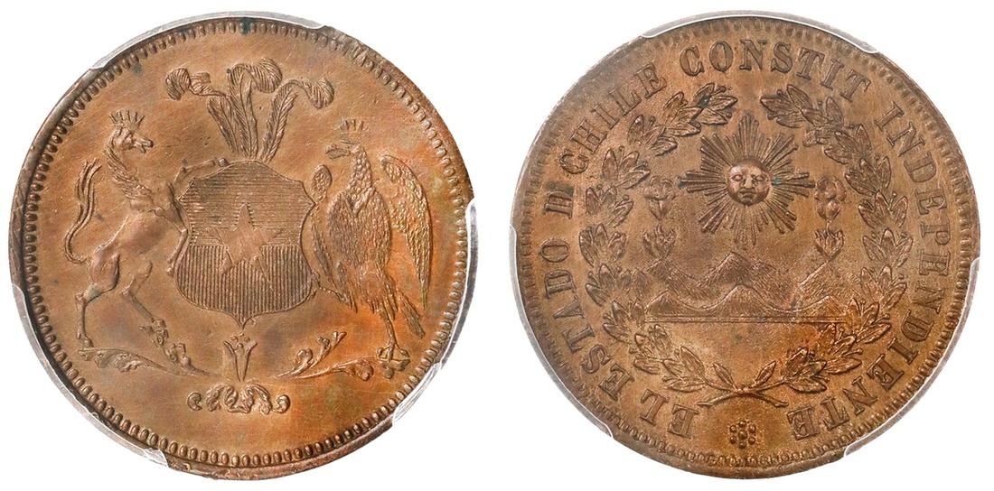 Chile. Pattern 8 Escudos in Brass, nd (ca. 1844). Struck by Weldon et Weil, Paris. Plumed and supported Arms, rev. Radiant sun above mountain peaks within wreath. KM PnA4. PCGS UNC Detail-corrosion removed.