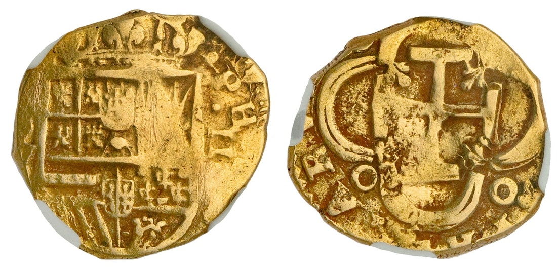 Colombia. Felipe IV (1621-1665). Cob 2 Escudos, mint and date off flan. 6.72 gms. Crowned Arms, rev. Cross potent in quadrilobe, annulets in angles. KM 4.1. NGC XF Details - Tooled.