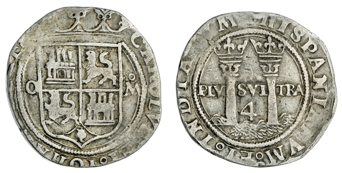 Mexico. Carlos y Juana la Loca (1516-1556). 4 Reales, nd, O-Mo. Mexico City. Bernardo de Oñate, assayer, struck 1552-1557. 12.2 gms. Crowned Arms, rev. Crowned Pillars, PLVS VLTRA and value across. KM 0018. Small old reverse nick. Good Very Fine. ex Sotheby's Sale, NY, June 25-26, 1999, lot 200 (part).