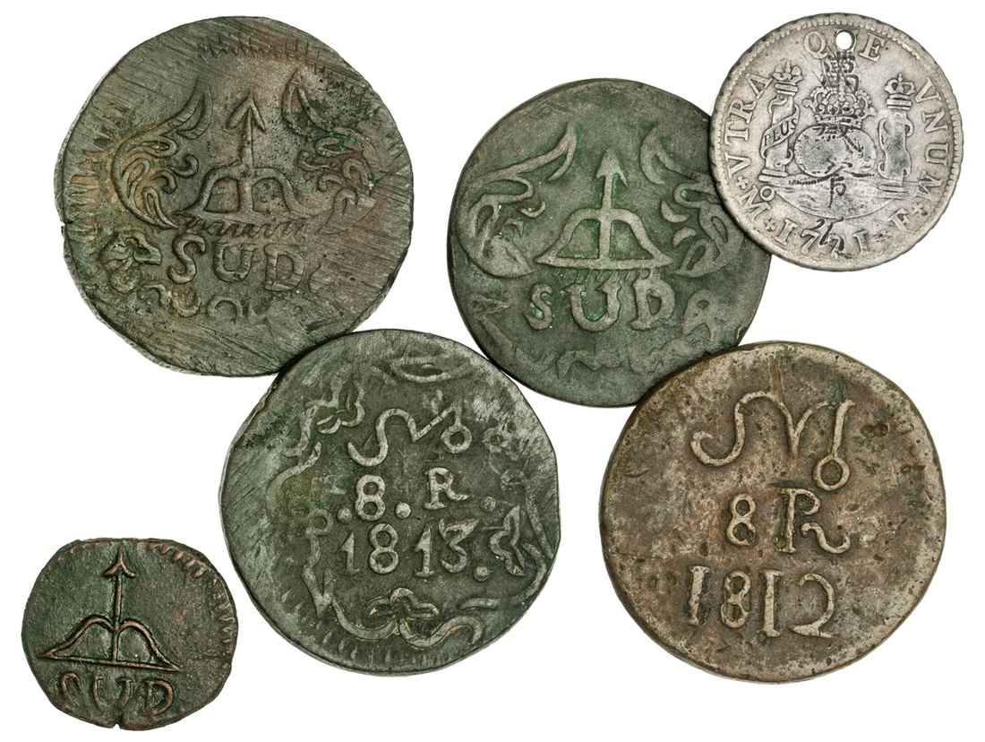 Mexico. War of Independence. Insurgent Coinage. Oaxaca. Lot: Copper 8 Reales, 1813 (2). 16.56 (small date) and 22.26 (large date) gms; 1814. 30.48 gms. Bow, arrow and SUD in floral cartouche. KM 234; 1812. 19.76 gms. No obverse cartouche. KM 233.2; 2 Reales, 1812. KM 226.1. Crude VF; also pierced 1771 Mo 2 Reales, graffiti. (6)