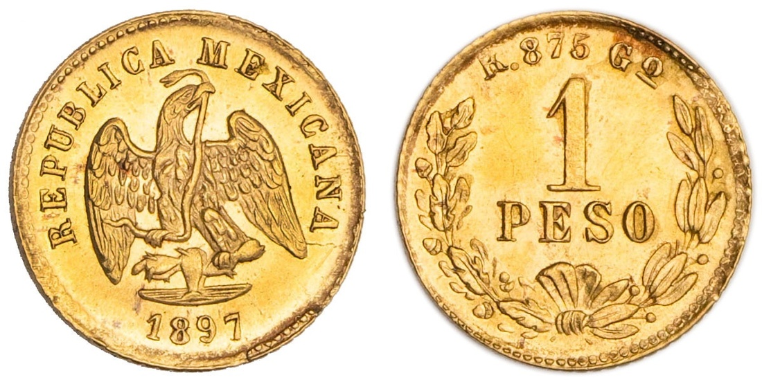 Mexico. Republica. Gold Peso, 1897 Go R. Guanajuato. Eagle standing facing on cactus, snake in beak, rev. Value within open wreath. Fr.161, KM 410.3. 4,280 pieces minted. Brilliant Uncirculated.