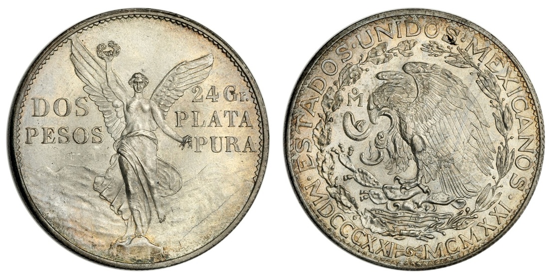 Mexico. Estados Unidos. 2 Pesos, 1921. Centennial of Independence. Winged Victory. KM 462. Choice Brilliant Uncirculated.