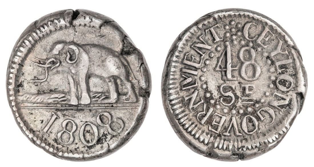 Ceylon. George III (1796-1820). 48 Stivers, 1808. Elephant left, date below. Large flan. KM 77. Edge splits as struck. Extremely Fine. Ex Sidney W. Harl and Kenneth W. Harl Collection.