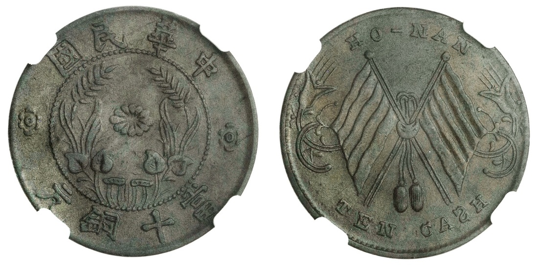 China. Republic. Honan. 10 Cash, nd (Ca. 1920). Chin Hua Min Kuo, rev. Crossed flags, letter S in CASH backwards. Y.A392.2. CNCS AU 53 BN.