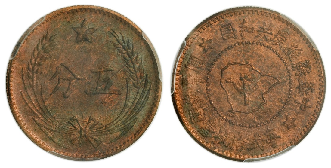China. Chinese Soviet Republic. 5 Cents, nd. Ca. 1960 Restrike. Hammer and sickle on map, rev. Star over value within wheat stalks. Y.507a. PCGS MS64 RB.