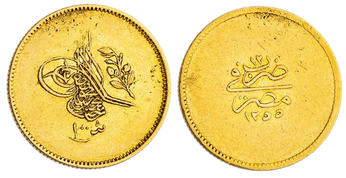 Egypt. Ottoman. `Abd al-Mejid (AH 1255-1277/1839-1861 AD). 100 `Irsh (Gi'ney), Acs AH 1255, year 12. Toughra, rose at right, value below, rev. Mint, accession date and regnal year. Fr.5, KM 235.2. Very Fine.