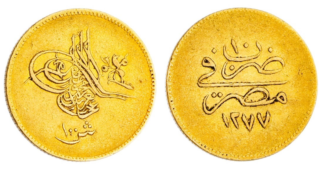 Egypt. Ottoman. `Abd al-`Aziz (AH 1277-1293/1861-1876 AD). 100 `Irsh (Gi'ney), Acs AH 1277, regnal year 10. Toughra, rose at right, value below, rev. Mint, accession date and regnal year. Fr.11, KM 263. Contact marks. Very Fine.