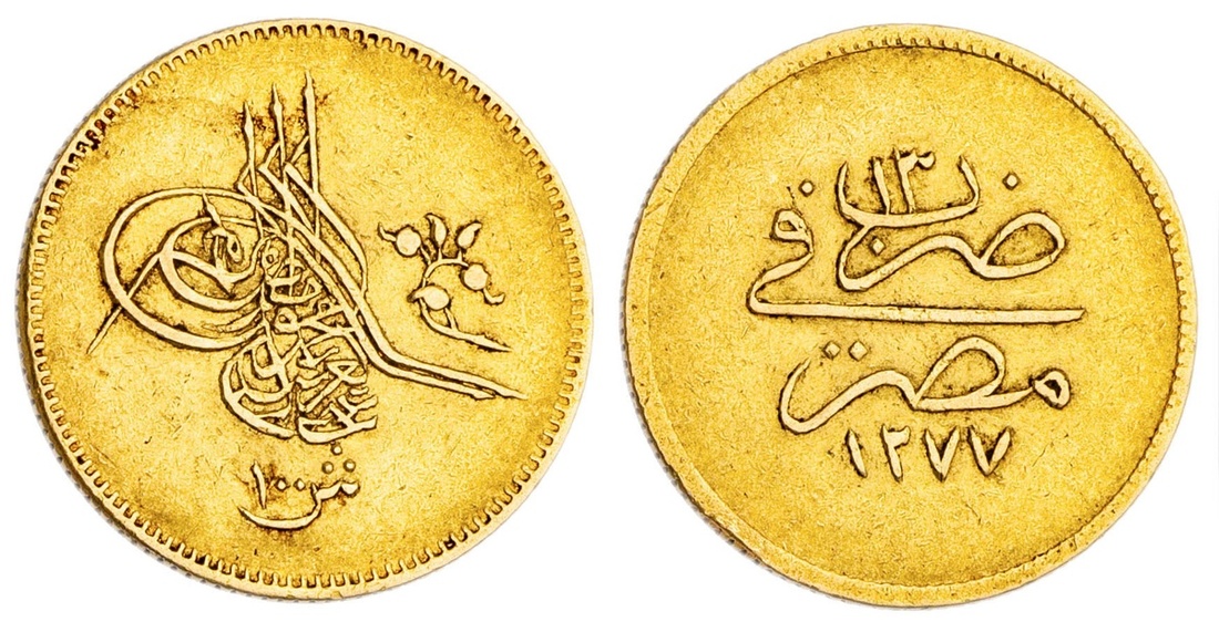 Egypt. Ottoman. `Abd al-`Aziz (AH 1277-1293/1861-1876 AD). 100 `Irsh (Gi'ney), Acs AH 1277, regnal year 13. Toughra, rose at right, value below, rev. Mint, accession date and regnal year. Fr.11, KM 263. Very Fine.
