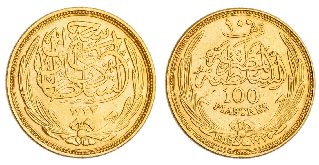 Egypt. British Protectorate. Hussein Kamil, as Sultan (AH 1333-1336/1914-1917 AD). 100 Piastres (100 Qirsh), AH 1335 - 1916 AD. Sultan's protocol, accession date below, within wreath, rev. al-sultaniyya al-misriya, value above in Arabic, below in English, within wreath. Fr.24, KM 324. Extremely Fine.