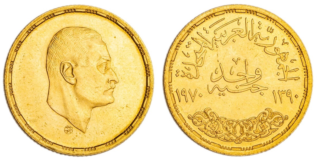 Egypt. U.A.R. Gold Gin'eh (Pound), AH 1390 - 1970. Head of Gamal `Abd al-Nasser right, rev. Value flanked by dates, al-gamhuriyya al-`arabiyya al-muttahida above, arabesque below. KM 426. Stacking marks and hairlines in fields. Uncirculated.