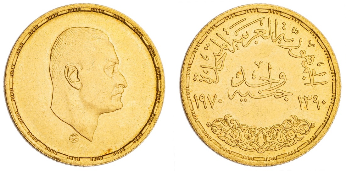 Egypt. U.A.R. Gold Gin'eh (Pound), AH 1390 - 1970. Head of Gamal `Abd al-Nasser right, rev. Value flanked by dates, al-gamhuriyya al-`arabiyya al-muttahida above, arabesque below. KM 426. Light stacking marks. Good lustre. Uncirculated