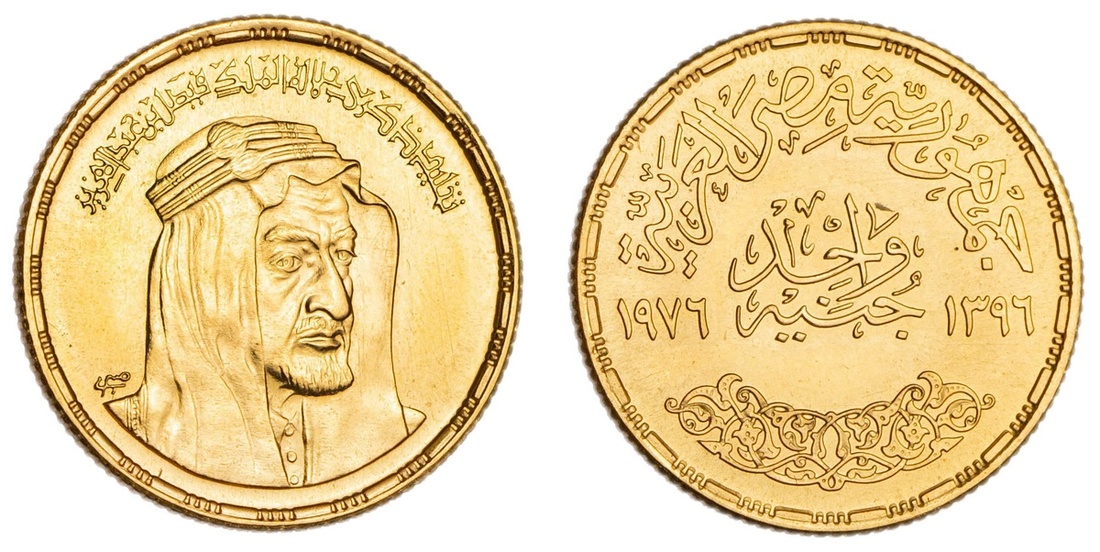 Egypt. Arab Republic. Gold Gin'ey (Pound), AH 1396 - 1976. Bust of Saudi King Faisal ¾ right, ornate Arabic legend above, rev. Value flanked by dates, gamhuriyya misr al-`arabiyya above, arabesque below. KM 458. 8,000 pieces minted. Brilliant Uncirculated.