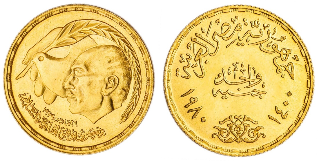 Egypt. Arab Republic. Gold Gin'ey (Pound), AH 1400 - 1980. Egyptian-Israeli Peace Treaty. Anwae Sadat head left with dove of Peace and palm frond quill, rev. Value flanked by dates, gamhuriyya misr al-`arabiyya above, arabesque below. KM 509. 9,500 pieces minted. Brilliant Uncirculated.