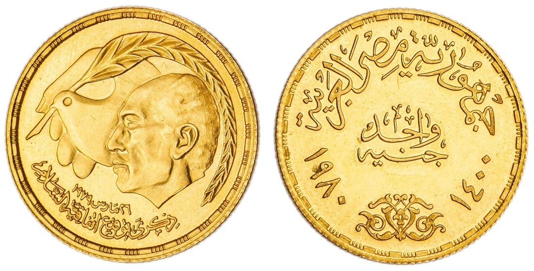 Egypt. Arab Republic. Gold Gin'ey (Pound), AH 1400 - 1980. Egyptian-Israeli Peace Treaty. Anwae Sadat head left with dove of Peace and palm frond quill, rev. Value flanked by dates, gamhuriyya misr al-`arabiyya above, arabesque below. KM 509. 9,500 pieces minted. Brilliant Uncirculated.