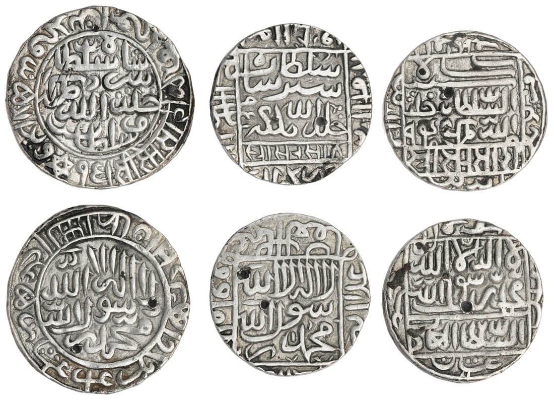 India. Delhi Sultanate. Sher Shah Suri (1538-1545). Trio of Rupees. Gwalior AH 951 (2) -different types: central legends in circle, and in square with Nagari legend; and Mintless type AH 948. VF-About EF. Ex Sidney W. Harl and Kenneth W. Harl Collection. (3)