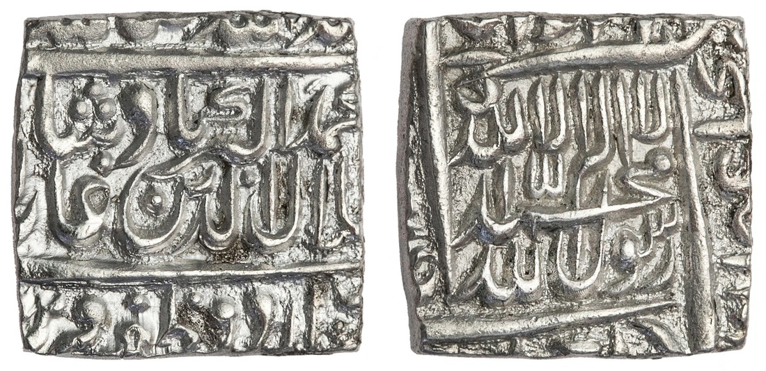 India. Mughal Empire. Akbar (1556-1605). Square Rupee, Urdu Zafar Qarin, undated (ca. AH 1000). 11.27 gms. Well-struck on a full flan. Choice Extremely Fine. Ex Sidney W. Harl and Kenneth W. Harl Collection.