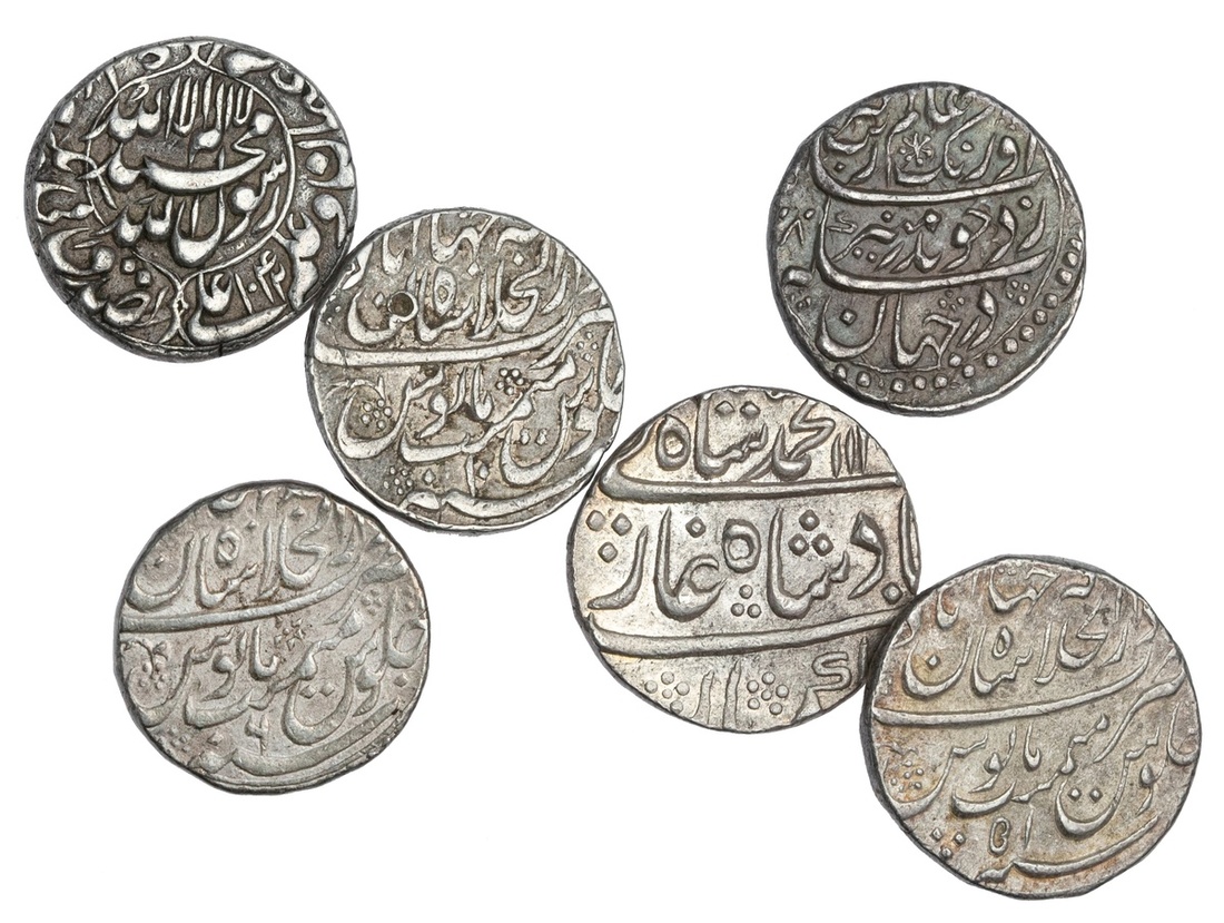 India. Mughal Empire. Lot of Rupees. Shahjahan (1628-1658). Lahore AH 1042 year 5. Good VF; Aurangzeb (1658-1707). Tatta AH 1080 year 12; Shahjahanabad AH 1119 year 51. Choice EF; Muhammad Shah (1719-1748). Khambayat AH 114x year 13. Choice AU; Shahjahanabad AH 113x year 6; and AH 114x year 10. VF. Ex Sidney W. Harl and Kenneth W. Harl Collection. (6)