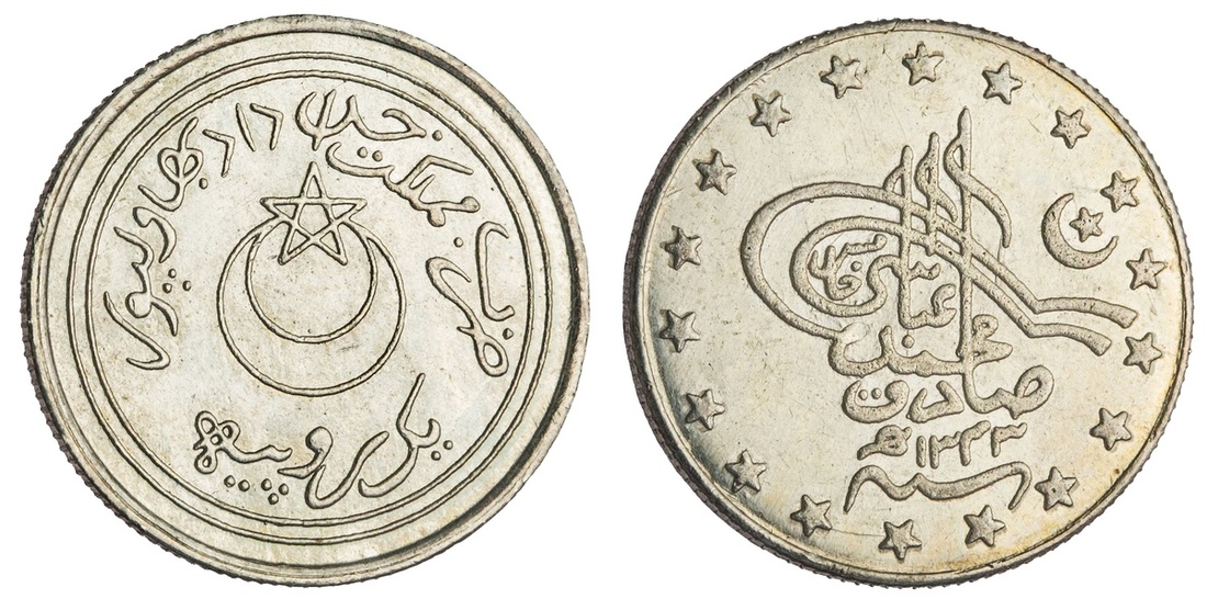 India. Princely States. Bahawalpur. Sir Sadiq Muhammad Khan V (1907-1947). Rupee, AH 1343. Toughra, circle of stars, rev. Crescent and star. Y.14. Believed to be a modern fantasy, but popular and collected. Uncirculated. Ex Sidney W. Harl and Kenneth W. Harl Collection.